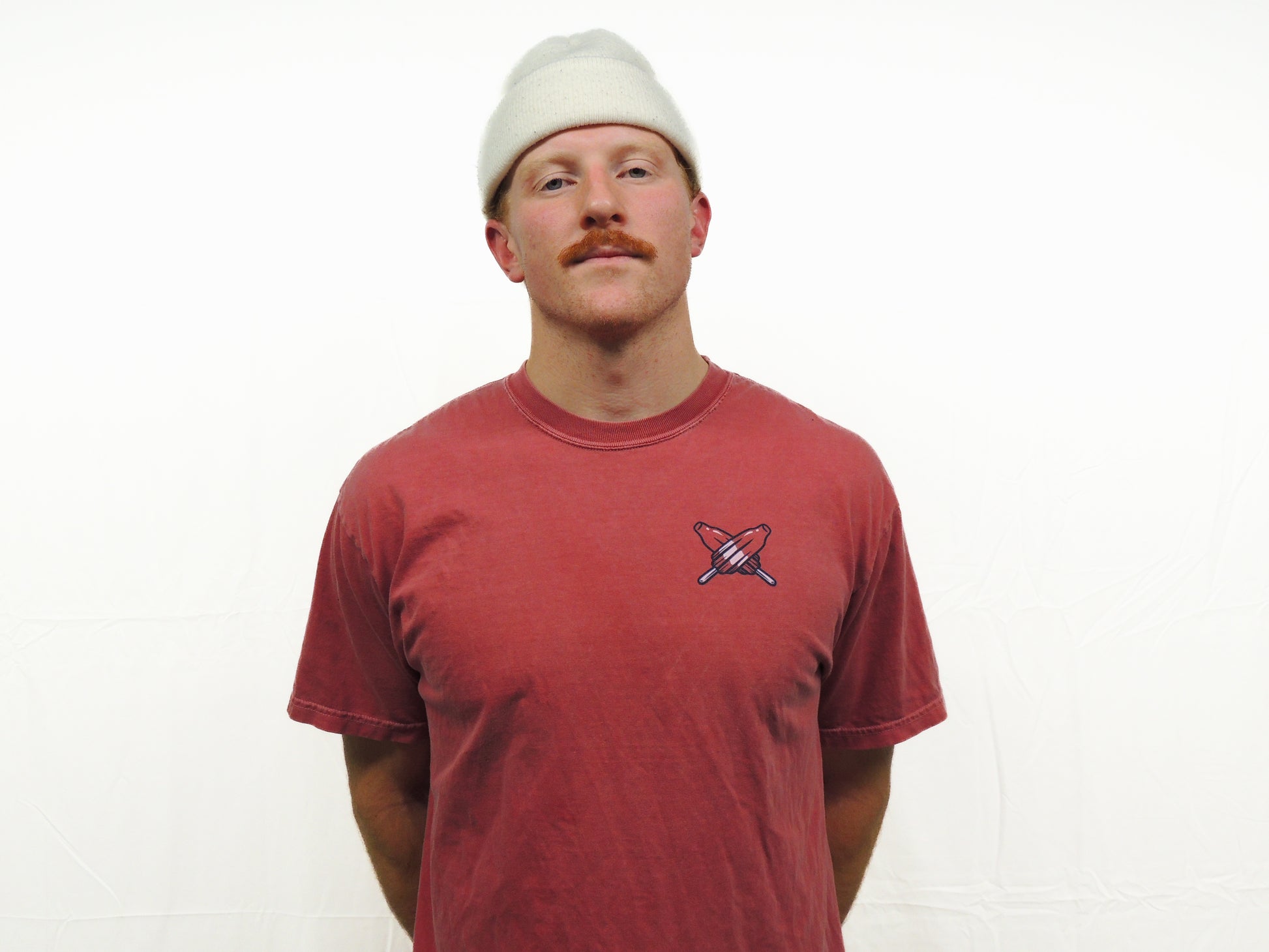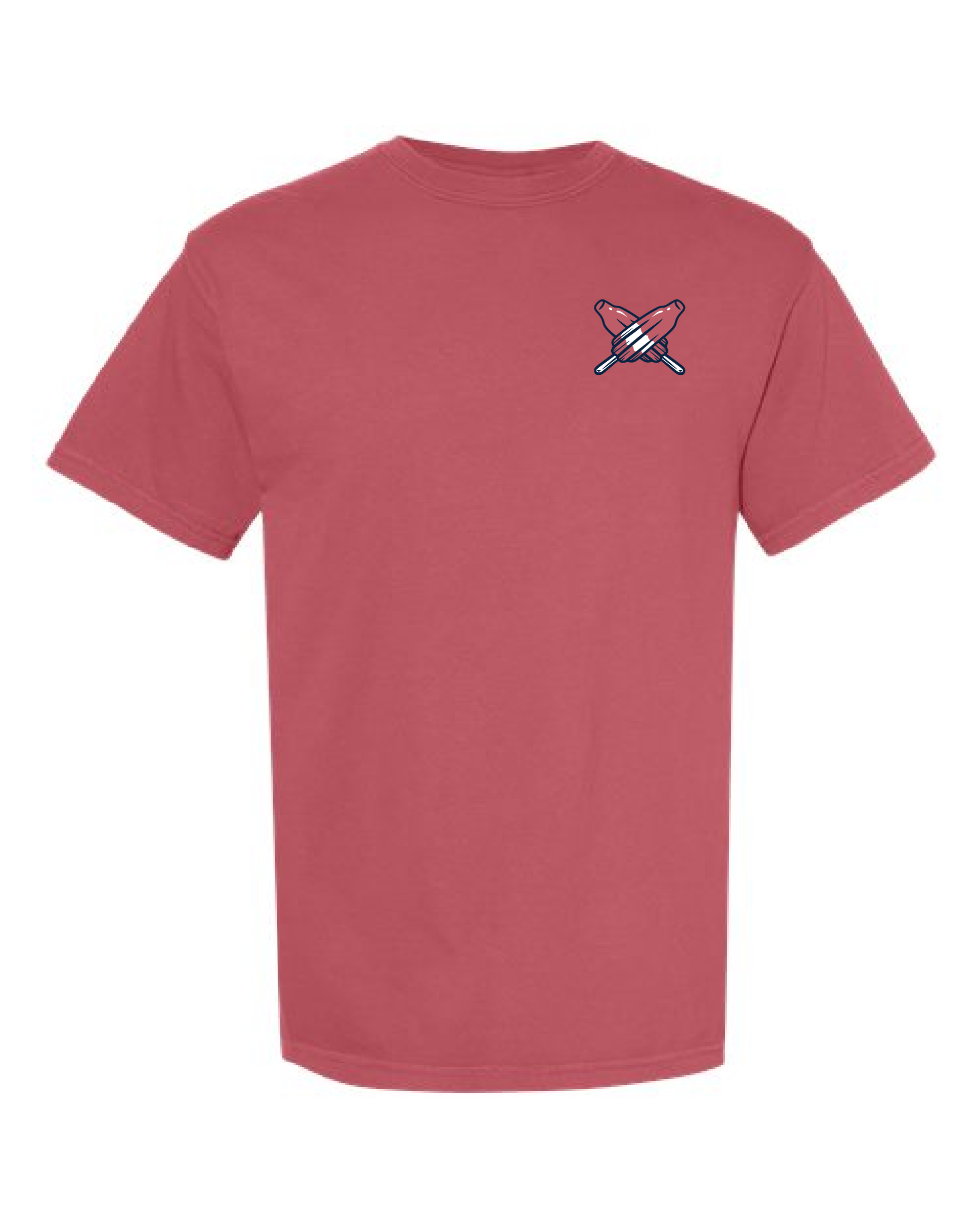Featured on a heavy weight garment dye 100% ring spun cotton t-shirt in a crisp crimson red.